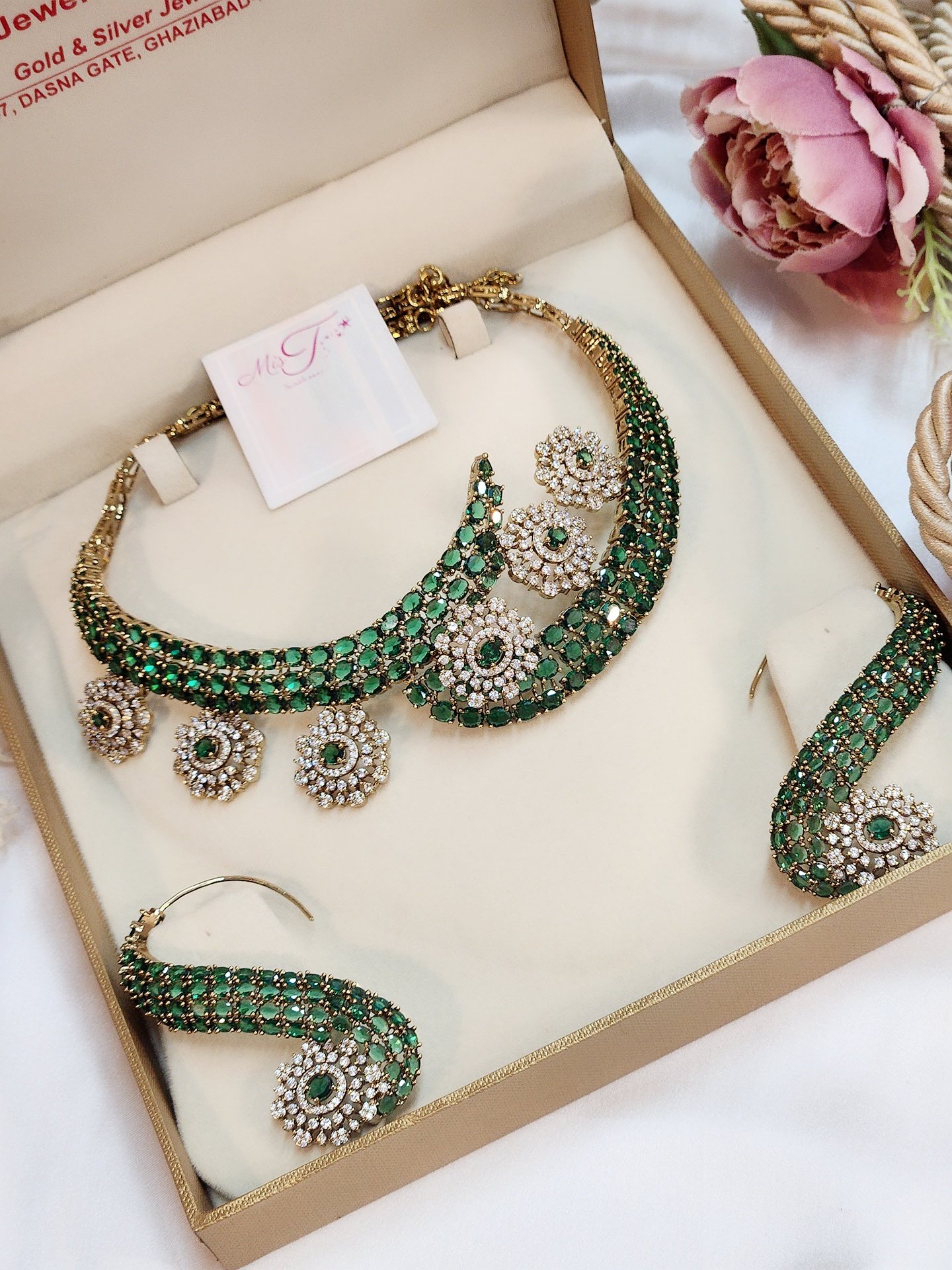 The Roseate Royale: Premium Emerald Green Zirconia & Antique-Finish Floral Suite