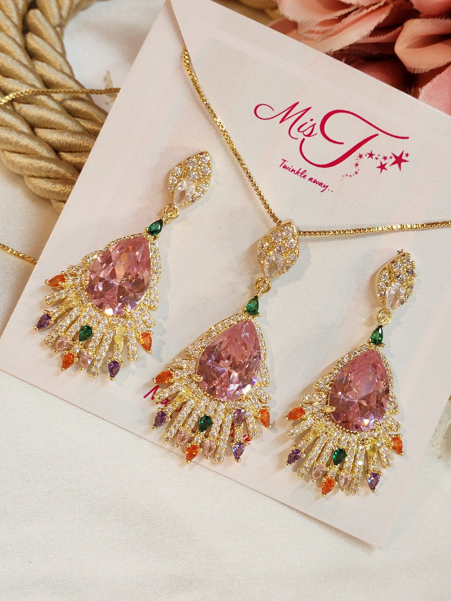 A wide collection of rose gold, gold and silver finish zirconia pendant sets in elite colors like white, rose pink, sage green, ruby, emerald, etc. A fine crafted article to suit your outfit in all kinds of occasions.
